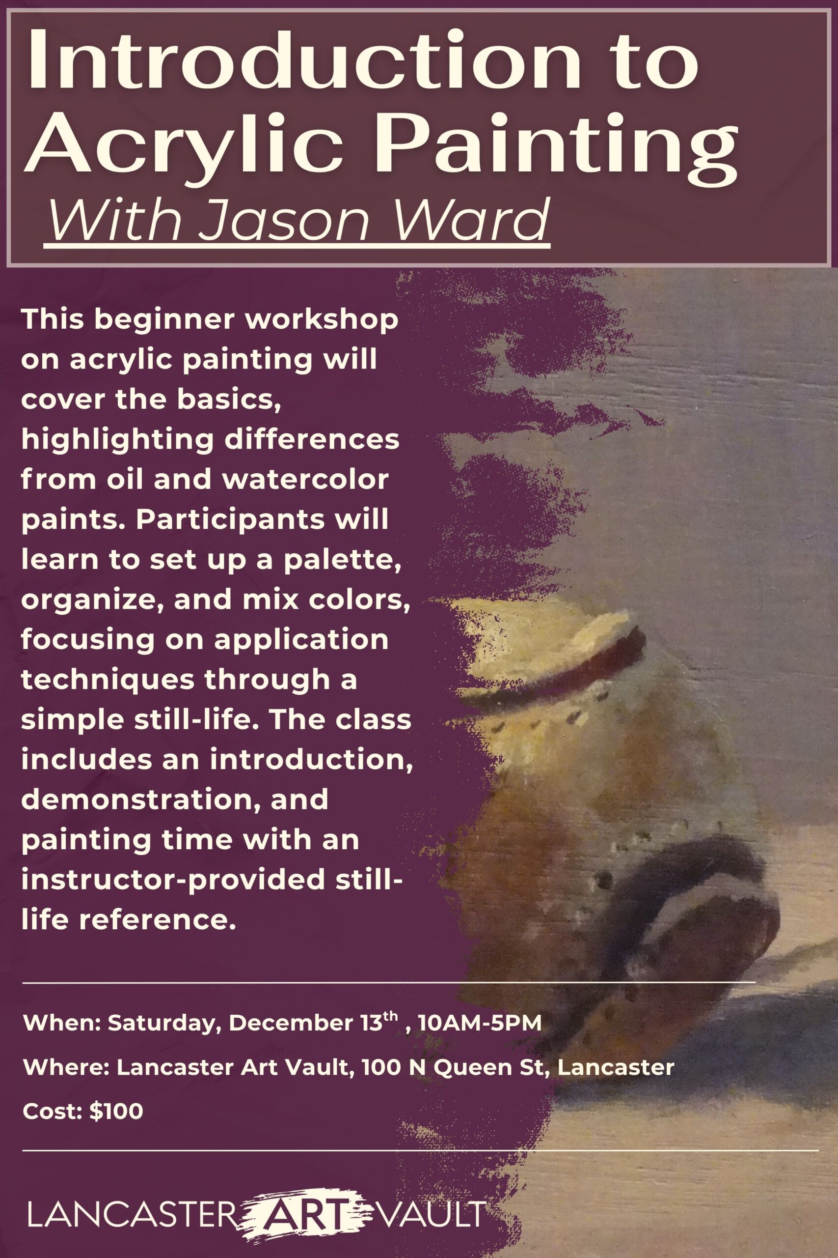 Saturday December 13th 10am-4pm This workshop is for anyone who wants to begin working with acrylic paints. This basic class will serve as an introduction to the paints themselves, and what […]