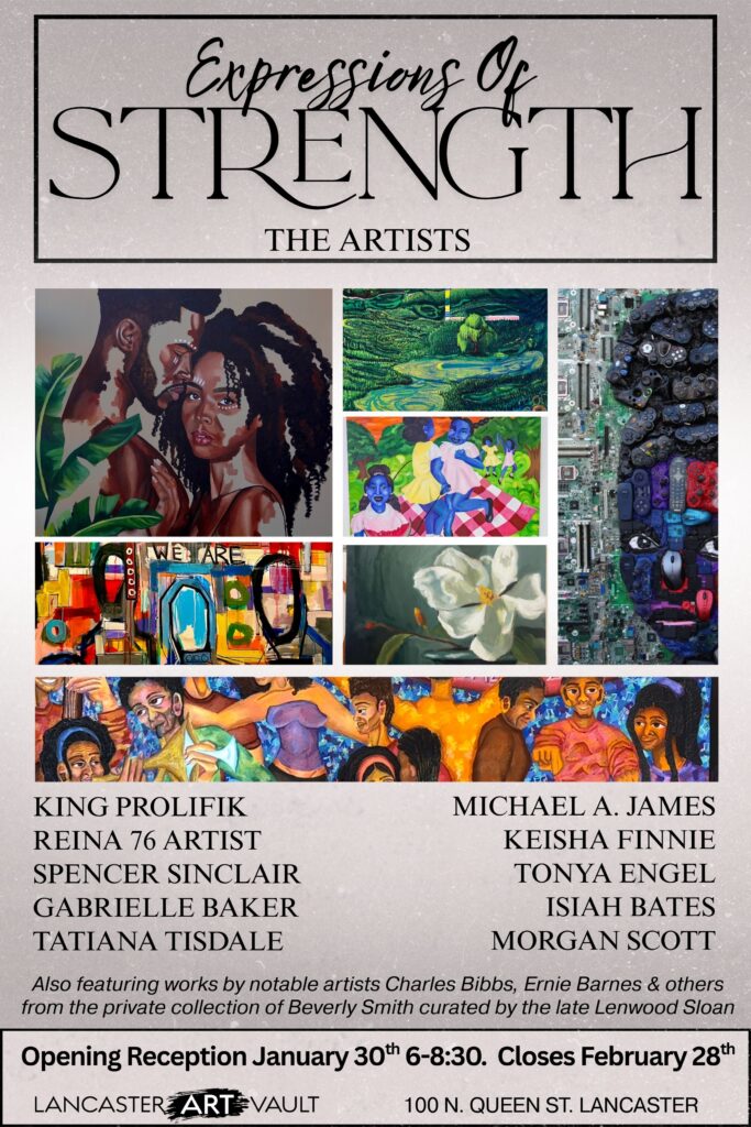 The Lancaster Art Vault presents a trio of compelling exhibitions this month celebrating creativity, identity, and imagination. Expressions of Strength: A Celebration of Black Art and Identity brings together the work of ten visual artists and twelve poets in a powerful multidisciplinary exhibition honoring Black voices through art and poetry. Also on view is Grandma’s Walls, a curated selection of works by celebrated artists including Charles Bibbs and Ernie Barnes, drawn from the private collection of talk-show host Beverly Smith and curated by her late brother, Lenwood Sloan. Rounding out the shows is resident artist SOOP’s Yes, And, a playful and thought-provoking mixed-media series inspired by the rules of improv, inviting viewers to reconsider what art can be—and what might come next. Exhibitions on display through February 28th, we look forward to seeing you in the galleries!